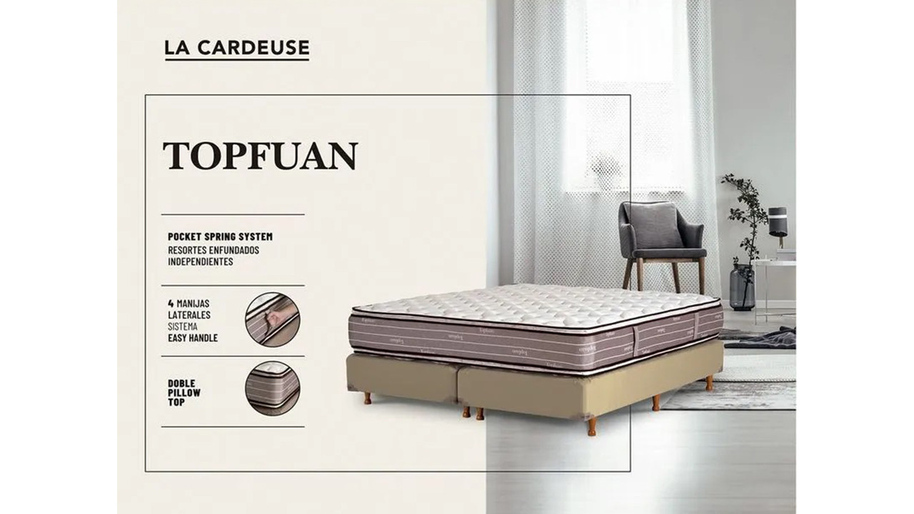 Cuando se habla de estilo, terminación y confort, en La Cardeuse lo llamamos Topfuan. Está basado en la tecnología de su sistema de resortes Pocket y complementado con su Doble Pillow Top, que maximiza el efecto Gradual Feeling Anti Stress. De esta manera se logra una sensación superior de mullidez al primer contacto para luego encontrar el soporte y la contención necesarias para relajarse. Bienvenidos al placer hecho realidad.