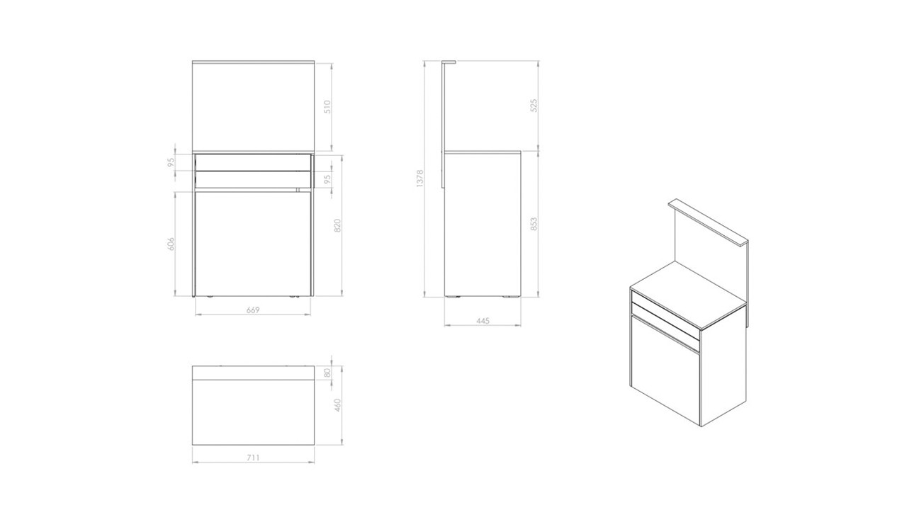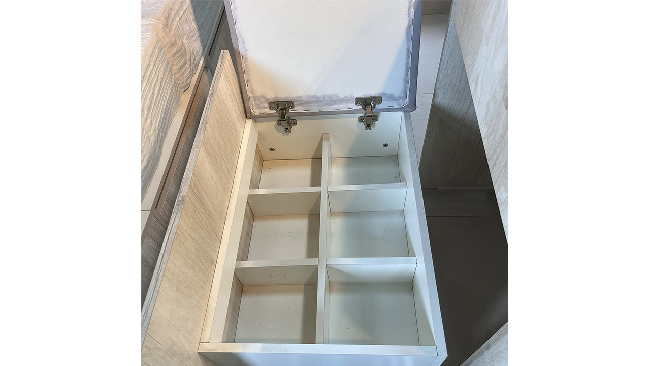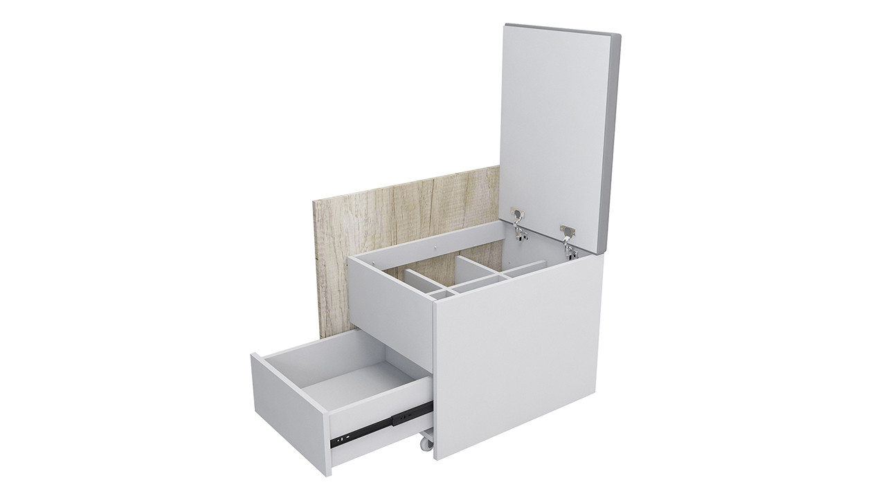 El asiento, cómodo y práctico, está tapizado y montado sobre ruedas para un fácil desplazamiento. Incluye un espacio de almacenamiento interno con divisores, y un cajón con cierre push en el asiento para mayor comodidad y seguridad.