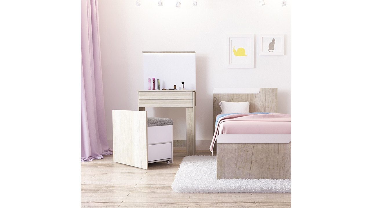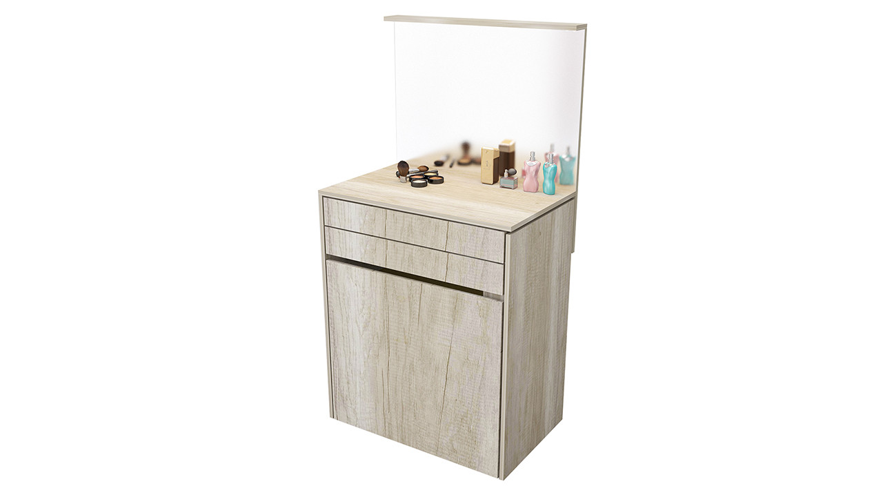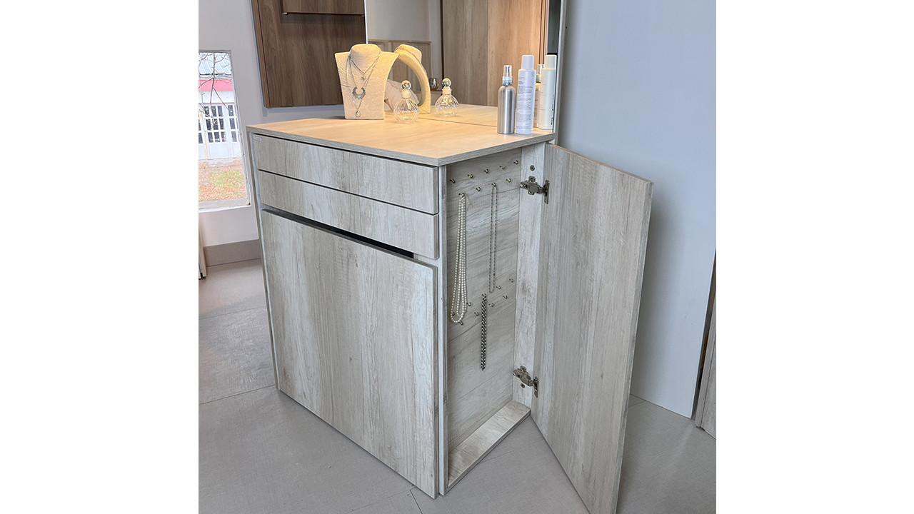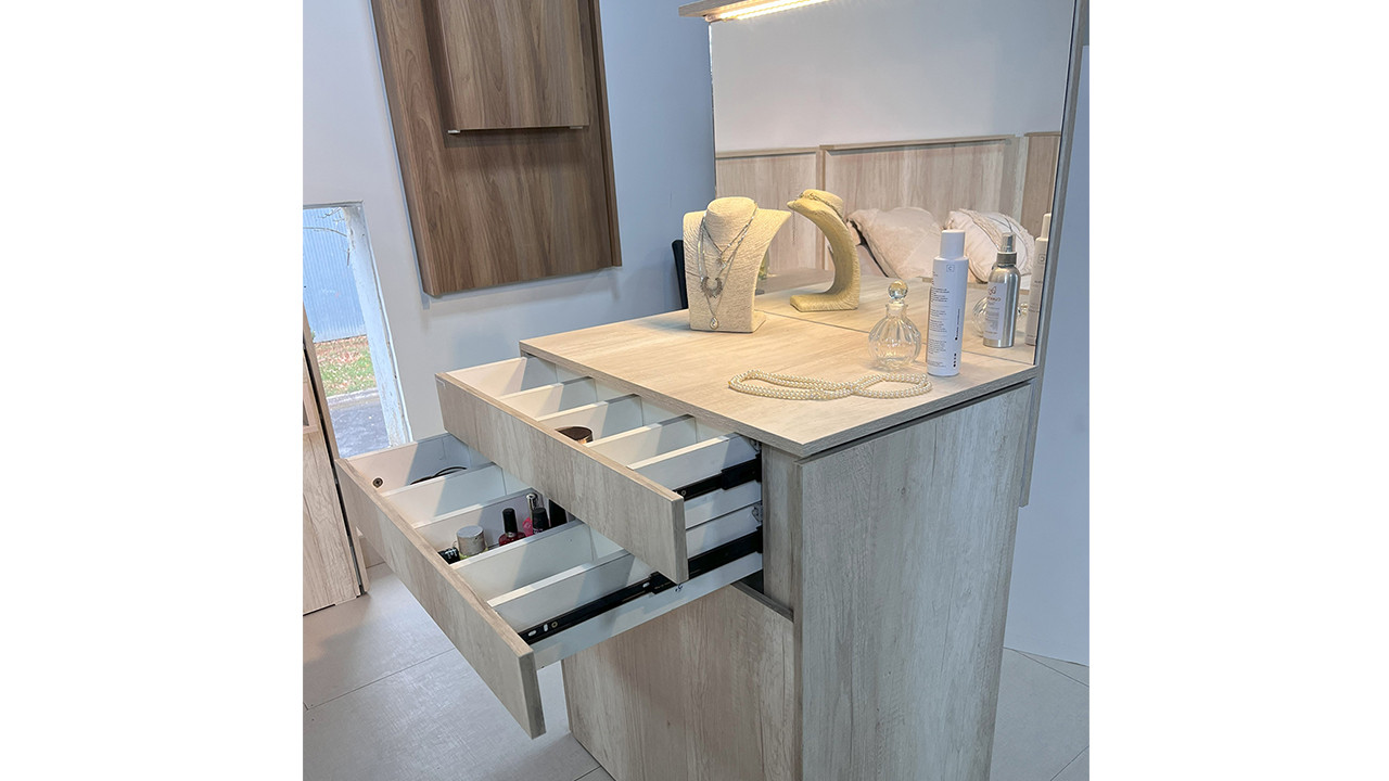 Este tocador no solo es perfecto para el cuidado personal, sino que también se puede utilizar como escritorio o mesa de trabajo, adaptándose a tus necesidades. Los cajones tienen divisores internos opcionales, lo que permite organizar tus objetos de forma más eficiente.