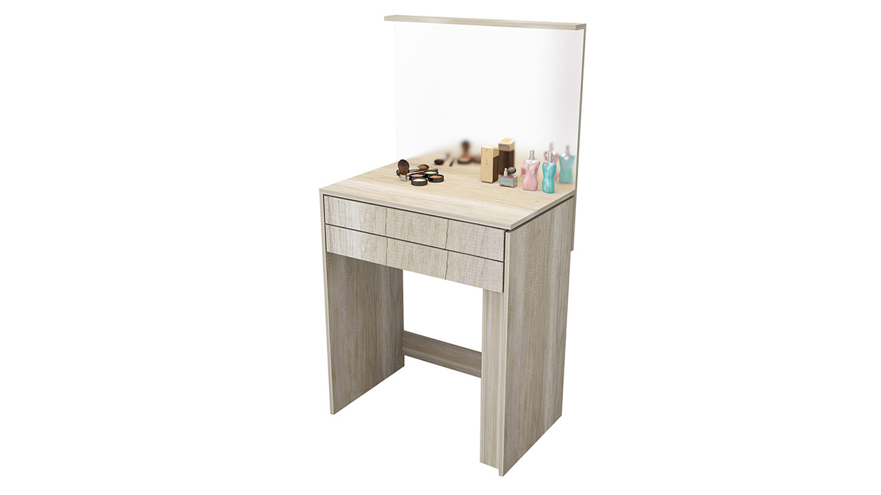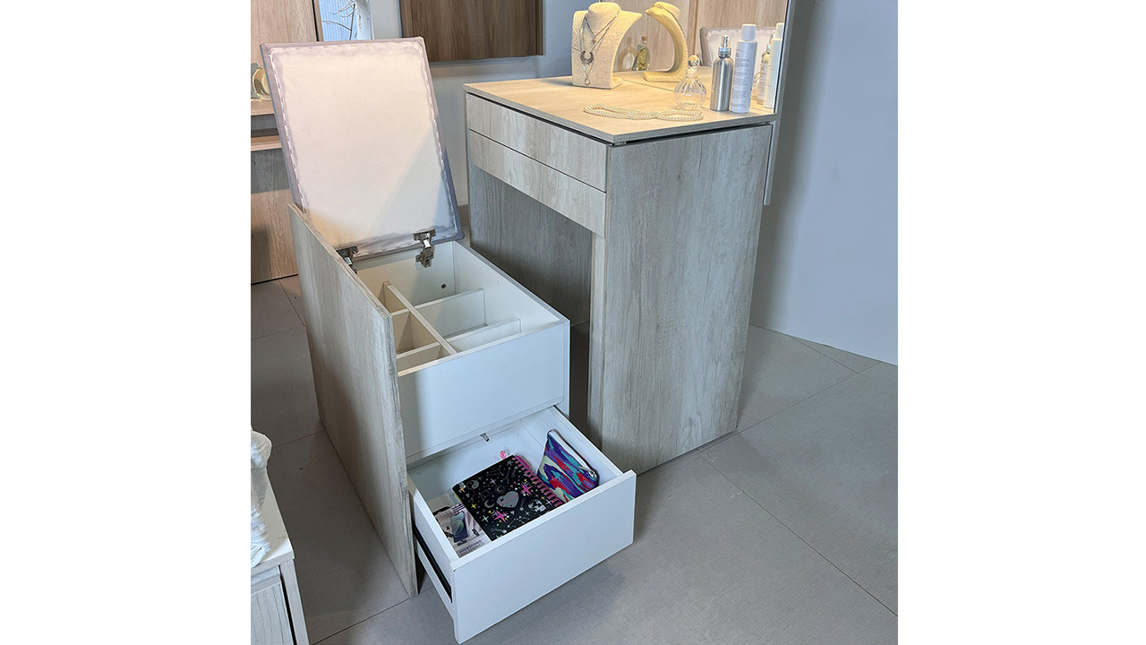 Con un diseño exclusivo y funcional, ésta mesa tocador está equipada con dos cajones con divisores internos y correderas telescópicas, que permiten un acceso suave y eficiente.