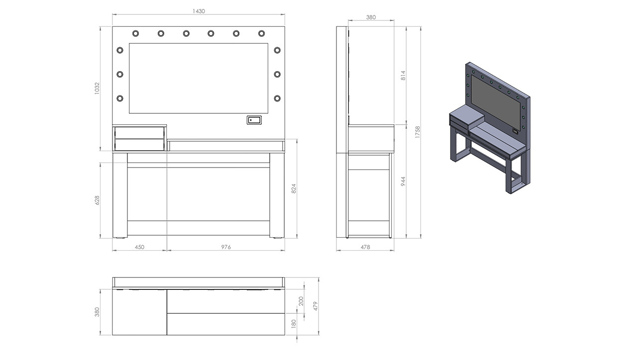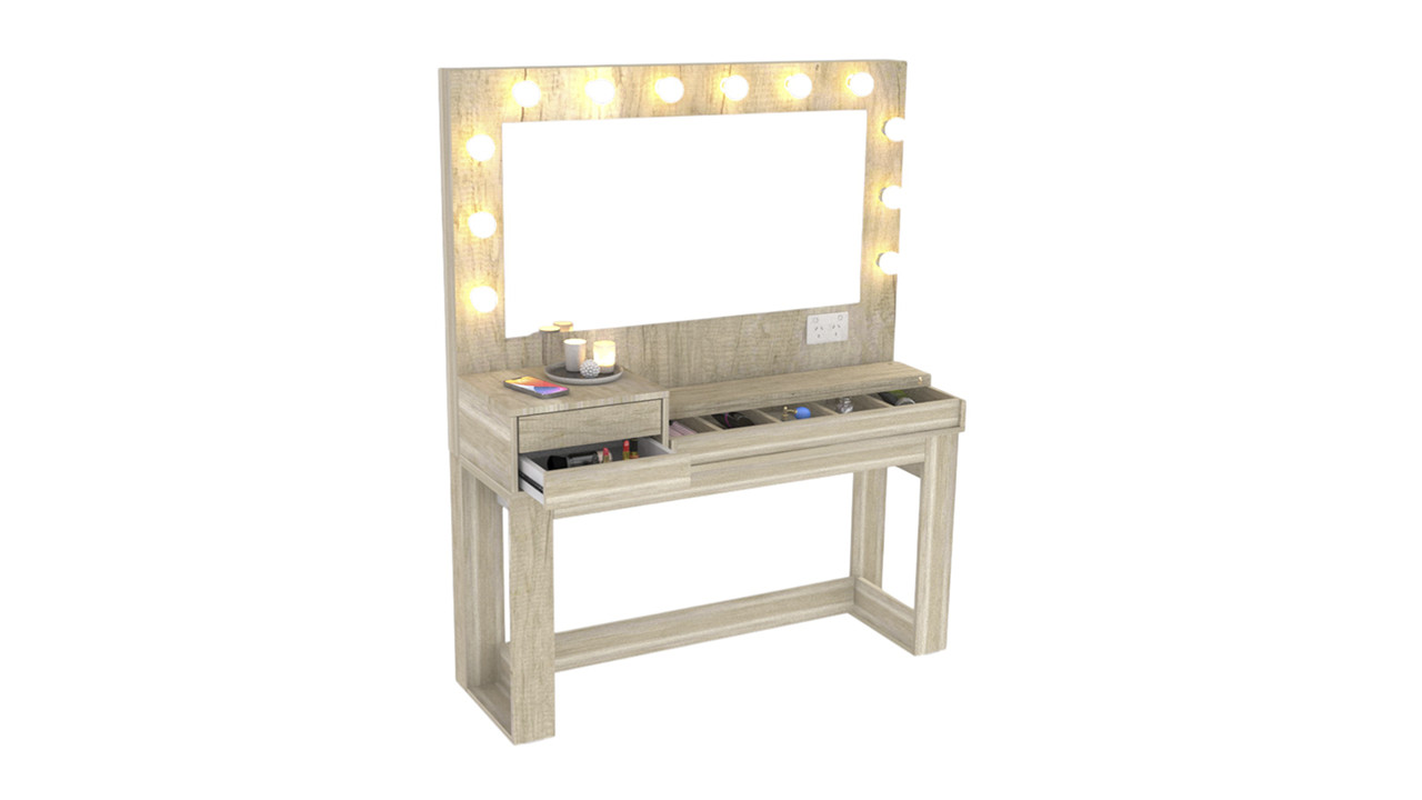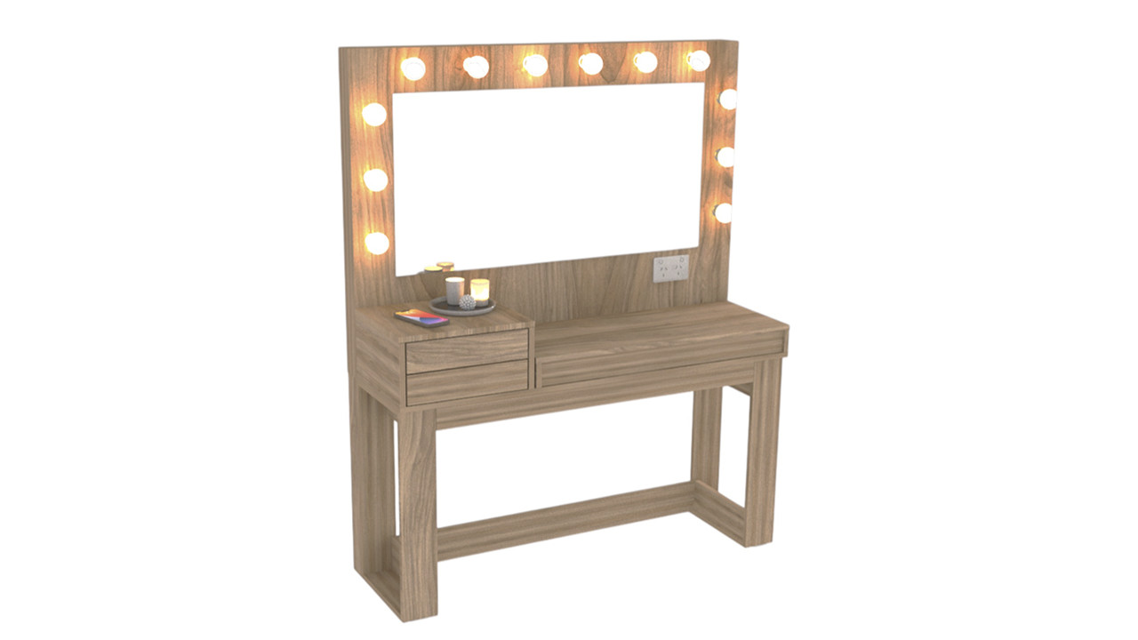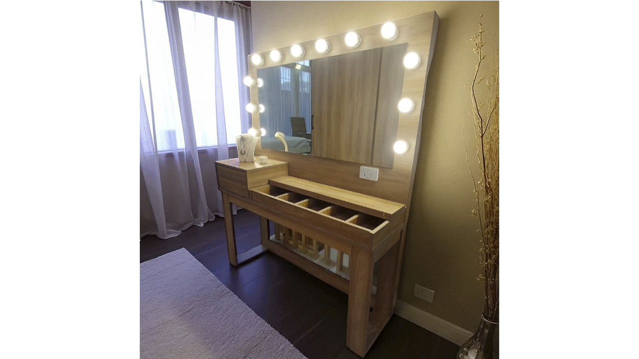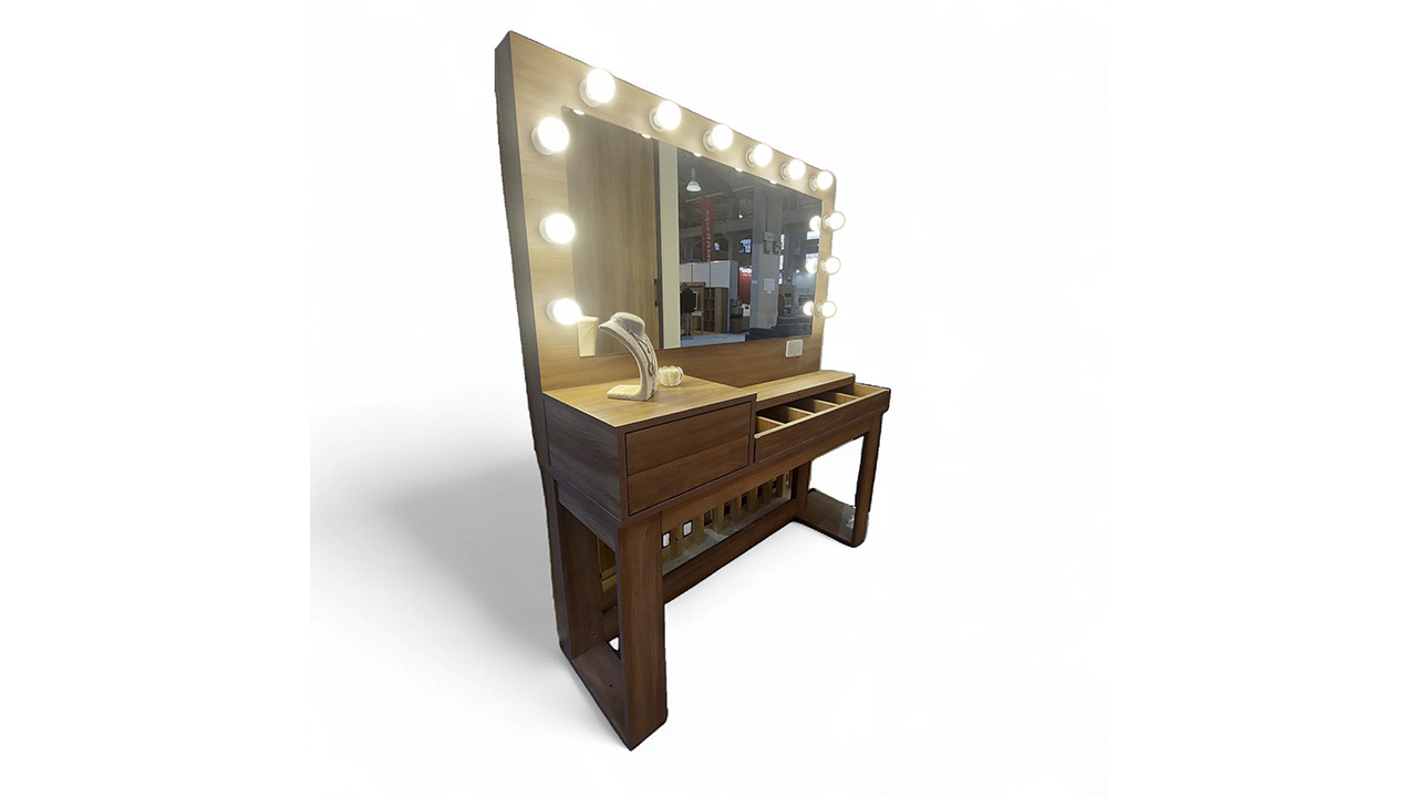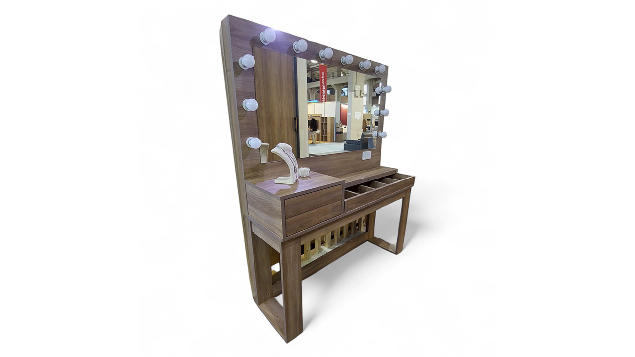 Eleva tu espacio de belleza con éste maquillador tipo Hollywood, una pieza de diseño único que fusiona la sofisticación de un tocador profesional con la practicidad de un mueble moderno y funcional.